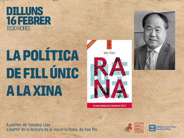Conversación sobre la política del hijo único en la China a partir de la lectura de la novela Rana (Kailas, 2011), de Yan Mo (Shandong,1955) ganador del Premio Newman de Literatura China (2009) y del Premio Nobel de Literatura (2012). A cargo de Yanping Liao, licenciada en Económicas por la Universidad de Beijing y Doctora en Antropología social y cultural por la Universidad Autónoma de Barcelona.